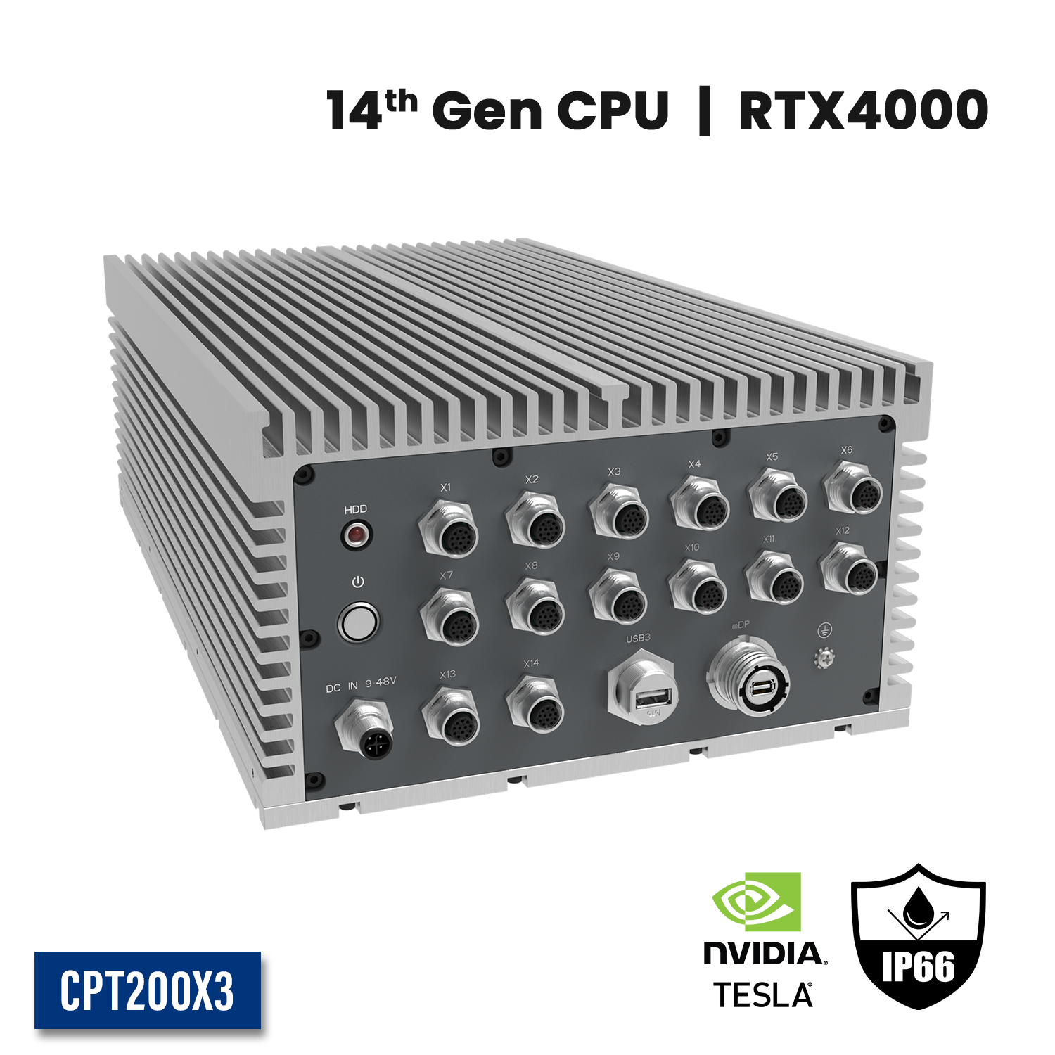 CPT200X3: IP66 Waterproof Fanless Embedded GPU Computer with 4 x 2.5GbE w/M12,1 x miniDP w/M20, 1 x USB3.0 w/M20, 4 x POE w/M12, 2 x CANBUS/8 bit-DIDO w/M12