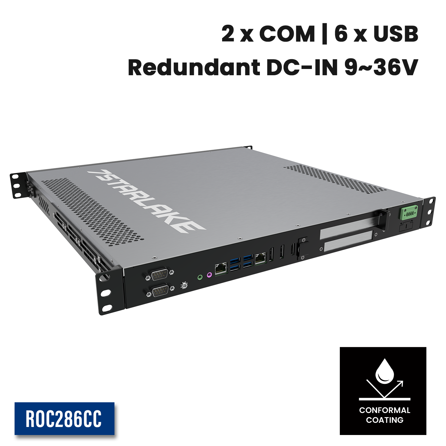 ROC286CC: 1U Fanless Rackmount Server with Conformal Coating, 2 x COM, 6 x USB, Redundant DC-IN 9~36V