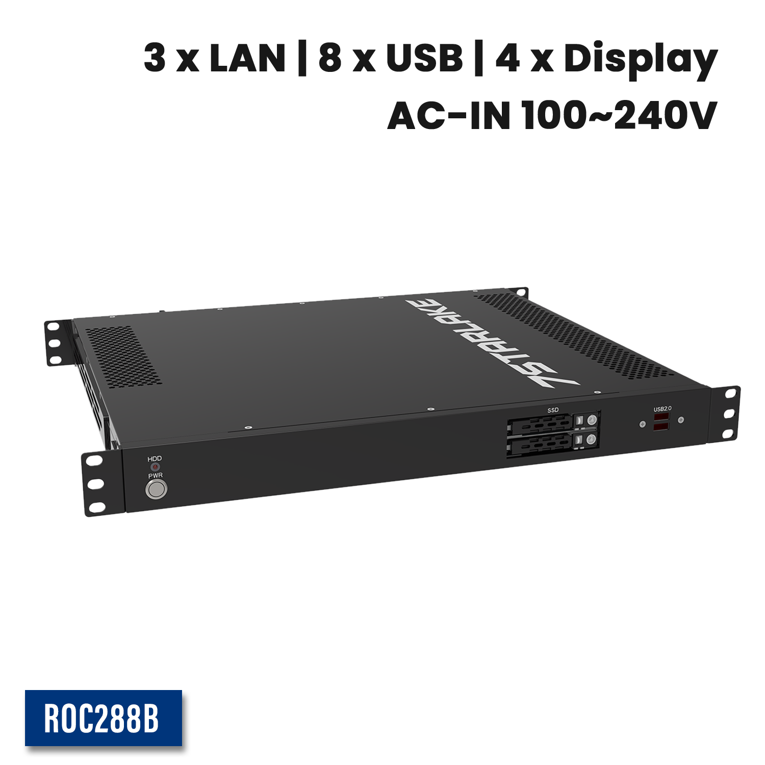 ROC288B: 1U Fanless Rackmount Server with 3 x LAN, 8 x USB, 4 x Display, AC-IN 100~240V